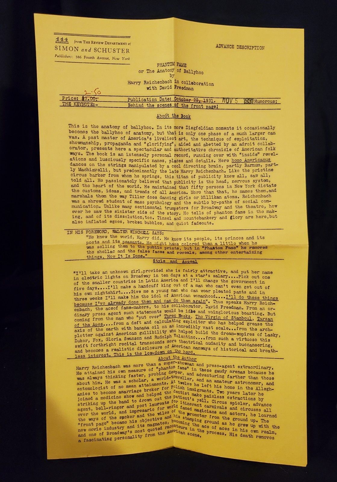 By Harry Reichenbach, with a forward by Walter Winchell (In Collaboration with David Freeman