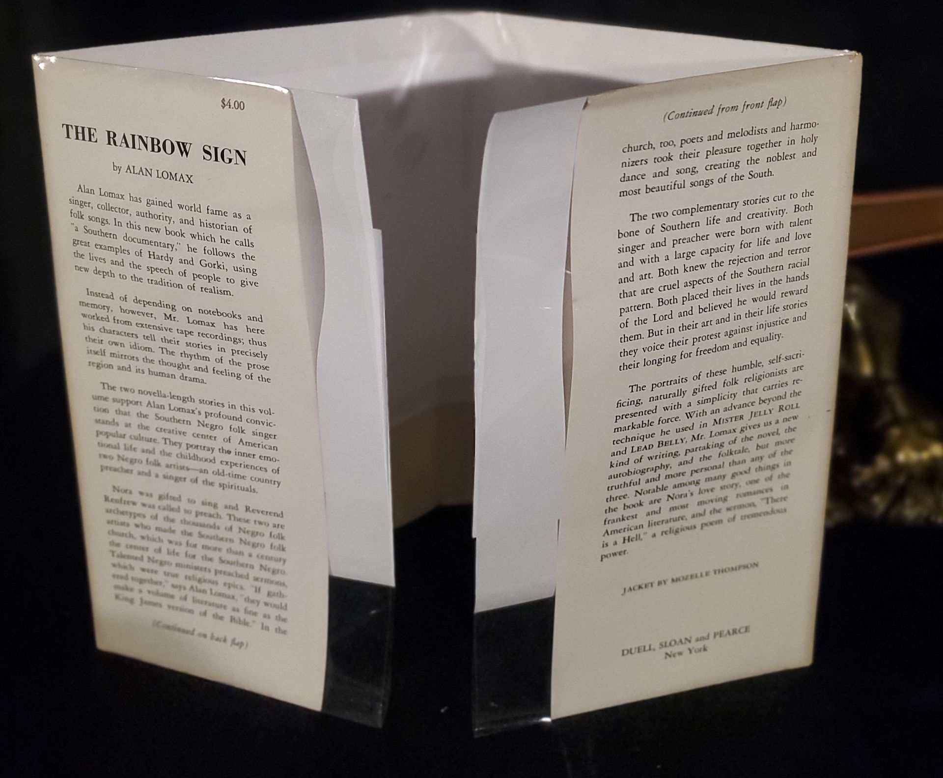 Nicely preserved previous collectors copy. Signed by Alan Lomax on the front end paper. Interior pages clean and bright with some minor toning as shown. Dust jacket has been placed in a high quality mylar sleeve. Minor shelf wear and rubbing present as shown. Binding and hinges are in good, strong condition.