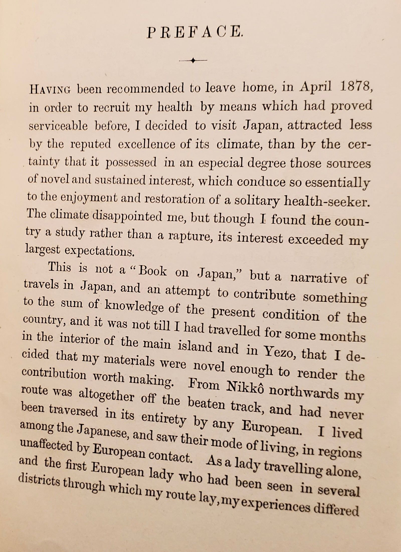 Unbeaten Tracks in Japan (日本奥地紀行, Nihon Okuchi Kikō) is a book by the English travel writer Isabella Bird, in the form of letters to her sister, describing her journey from Tokyo to Hokkaido in 1878, when she was 46.