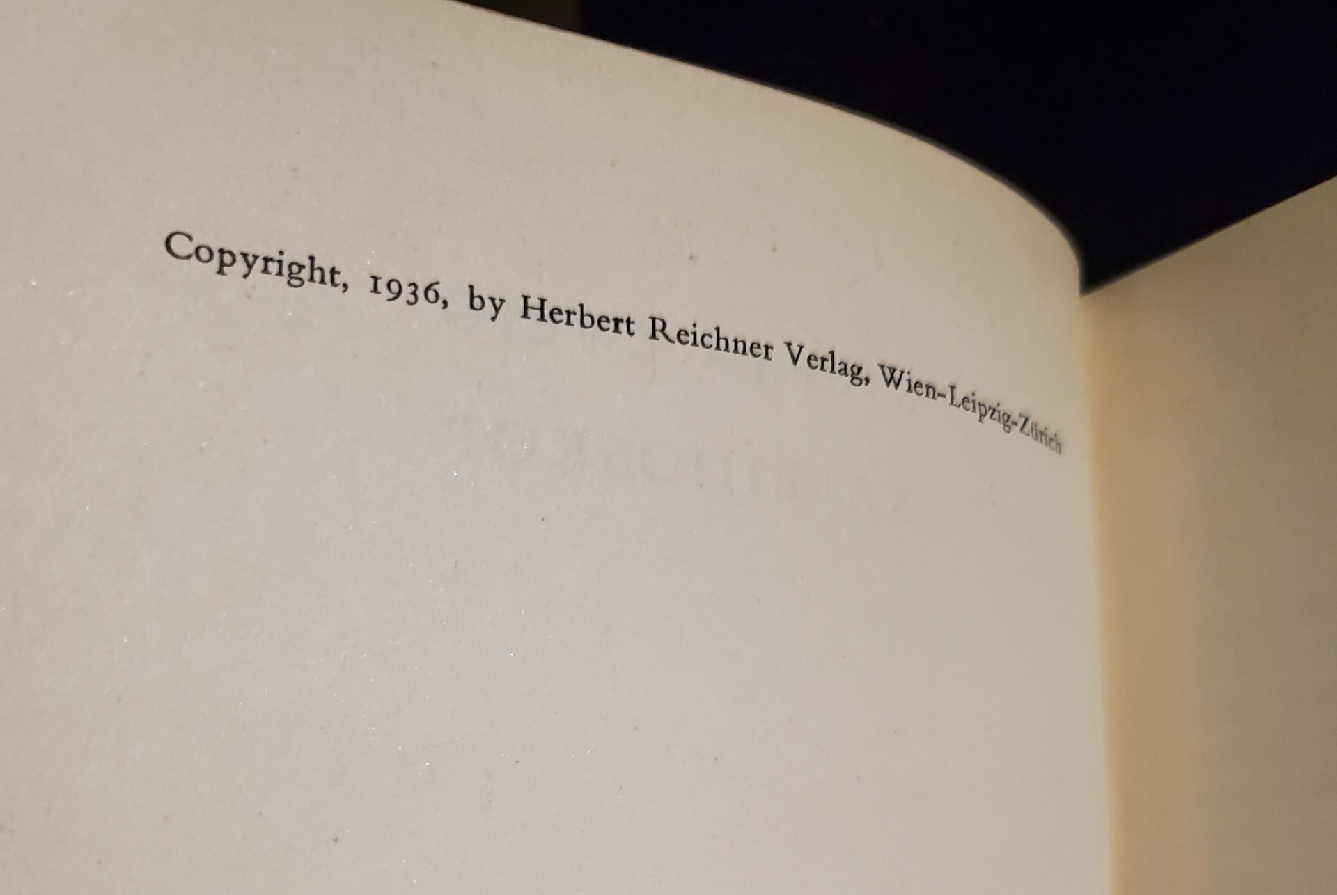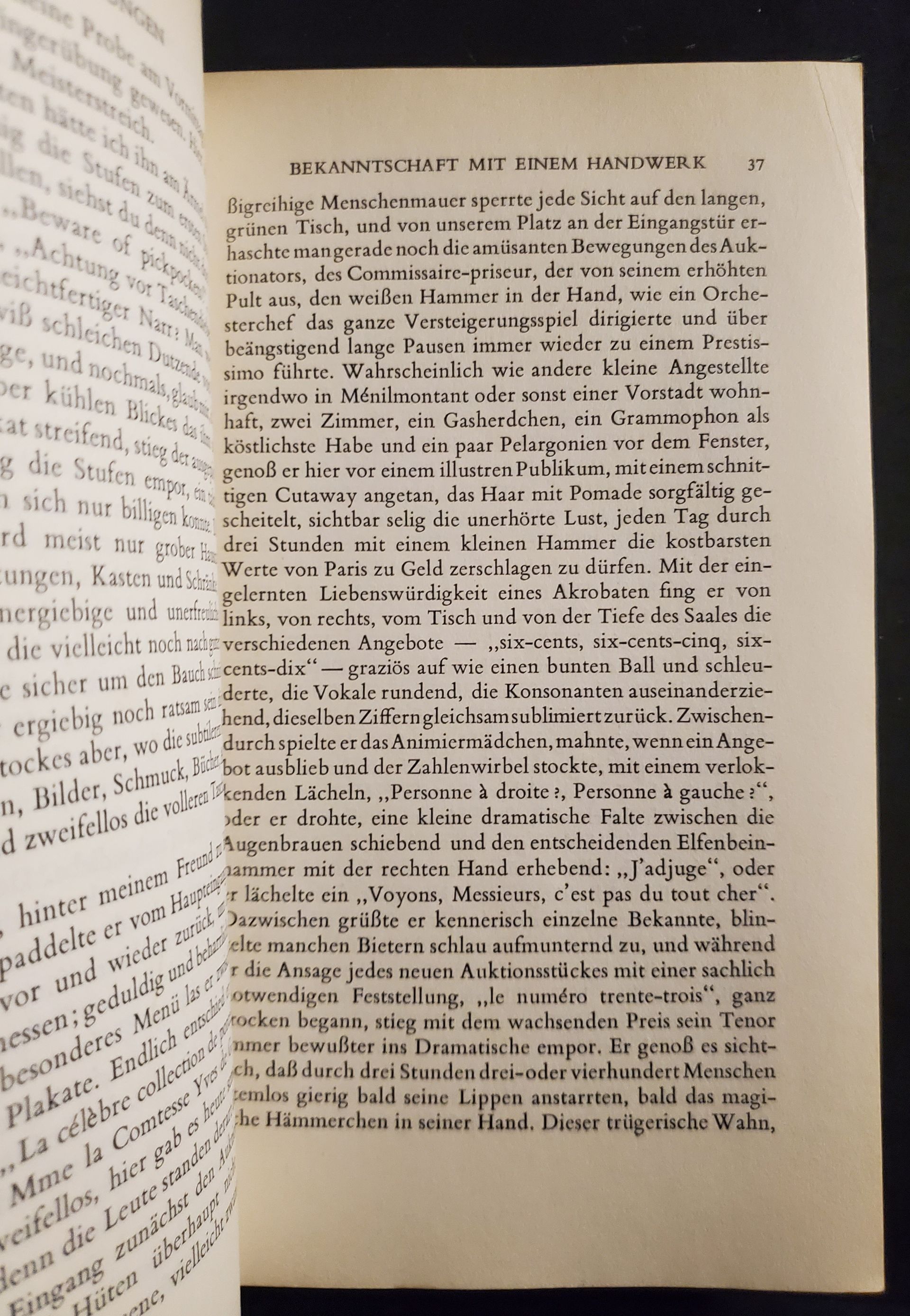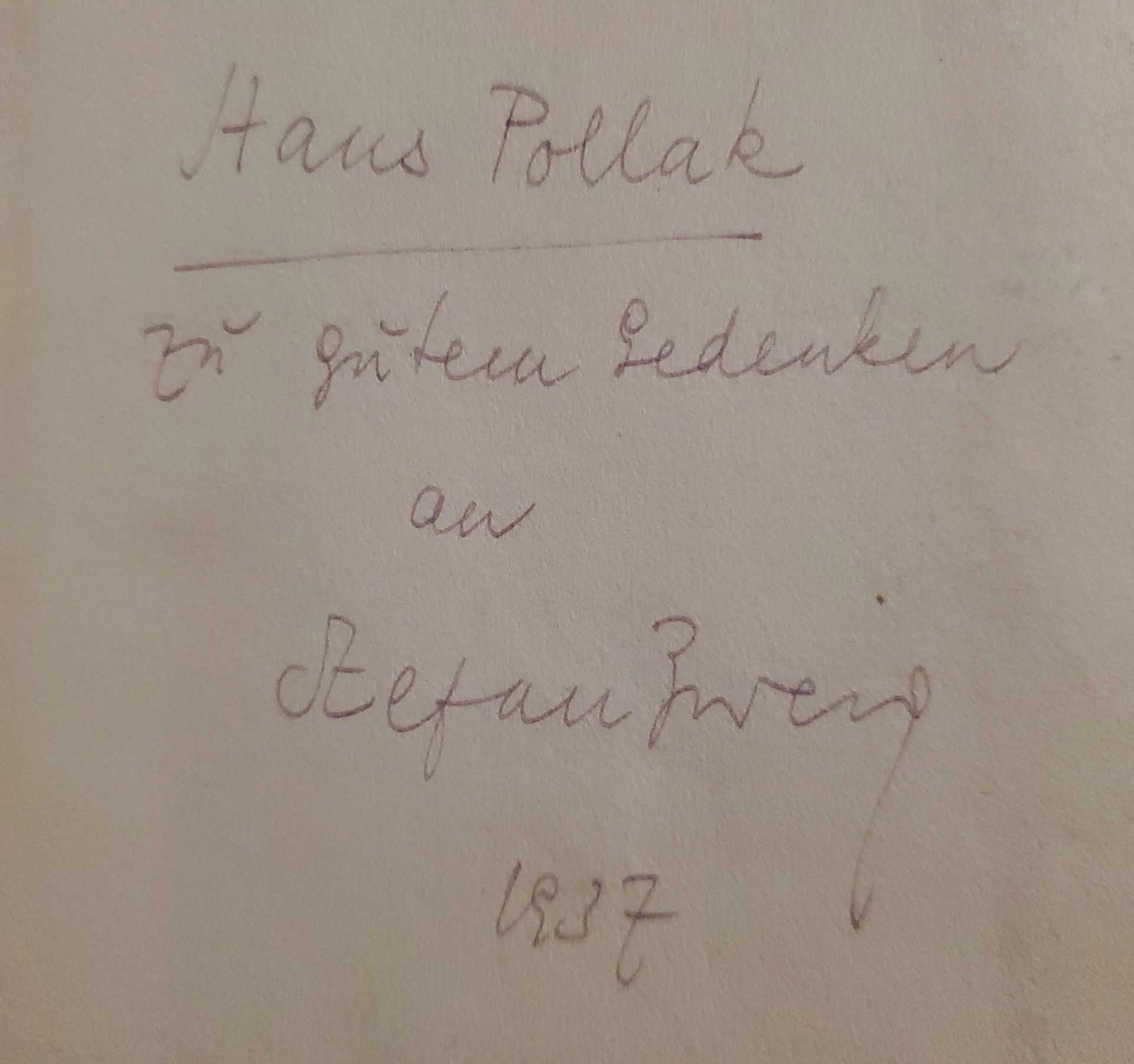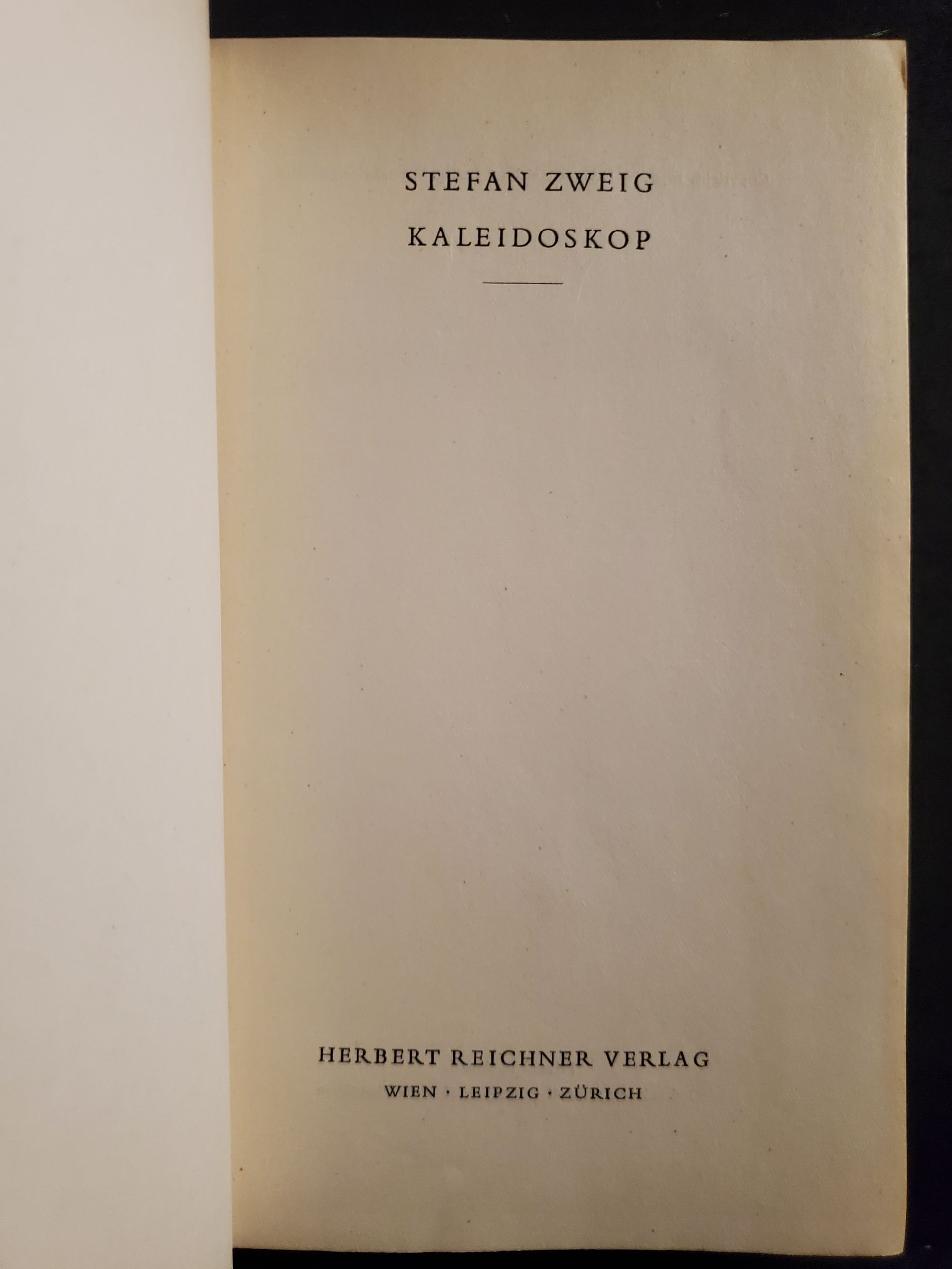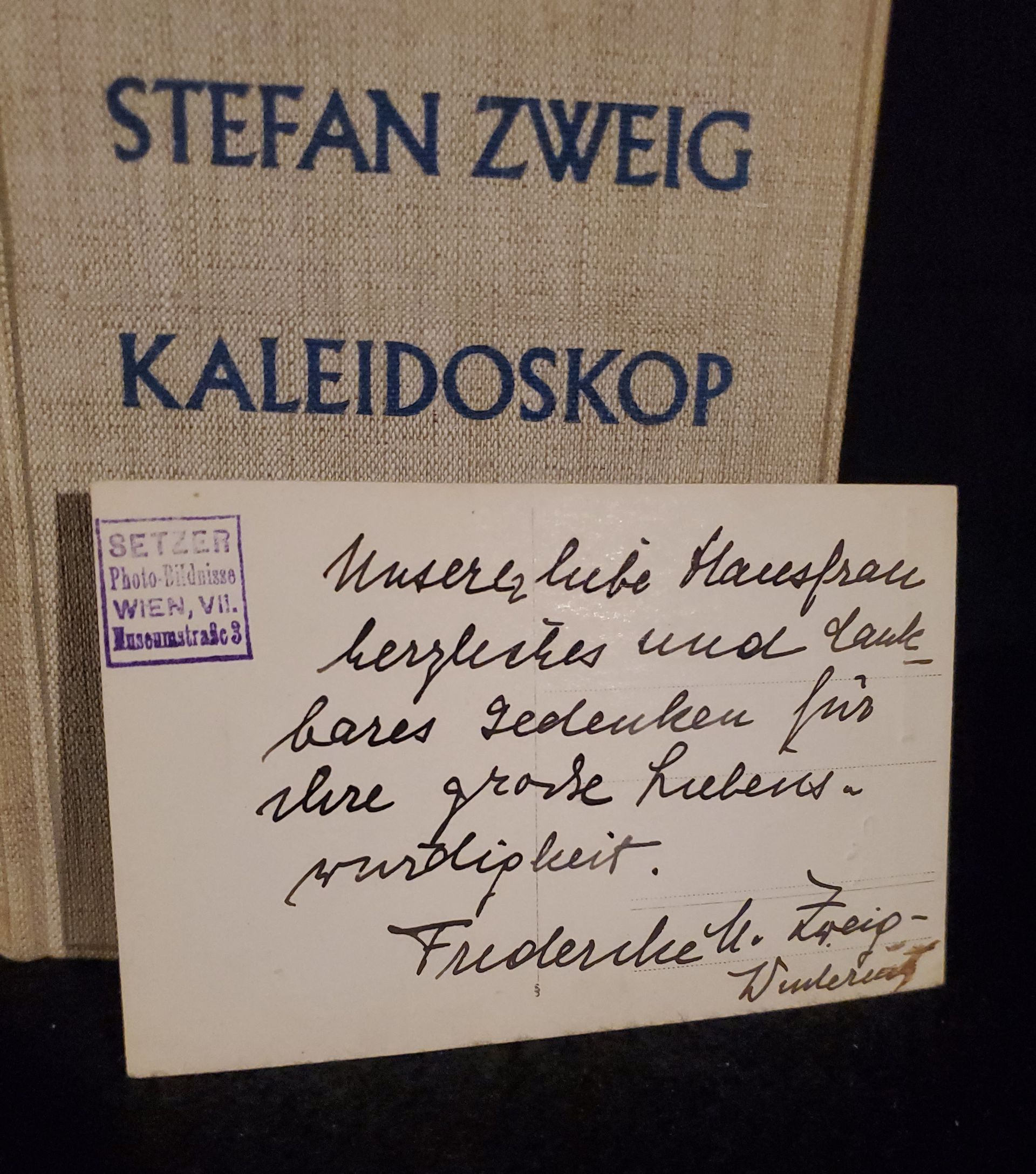 Presented here is a *signed* first German edition of Stefan Zweig's "Kaleidoscope." Signed by Zweig on front fly-leaf as shown in photo #8 & #9. *Also* comes with a 3x5 portrait photo of Zweig, ALSO SIGNED BY STEFAN ZWEIG in faint blue ink, in addition to an inscription by Frederick Zweig to the rear. Nicely preserved previous collectors copy. Interior pages are clean and bright with some minor toning as shown. Corners are sharp and the blue titling to the spine and front board is nice and bold. Minor shelf wear and rubbing present as shown. Binding and hinges are in good, strong condition.